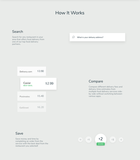 Much like how other search engines work, we do the work for you and compile all the information about food delivery fees and time estimates into one easy to use platform. Just enter your address, give us a second to gather the information, and then view the results sorted by delivery fees, delivery times, or recommended restaurants.