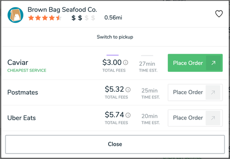 We compare prices from our third party delivery partners (Uber Eats, Postmates, Caviar, Eat Street, Delivery.com, and others) as well as individual restaurants who offer their own independent delivery or carry out option on the results page. You can also search by cuisine type, and view corresponding restaurants in your area.